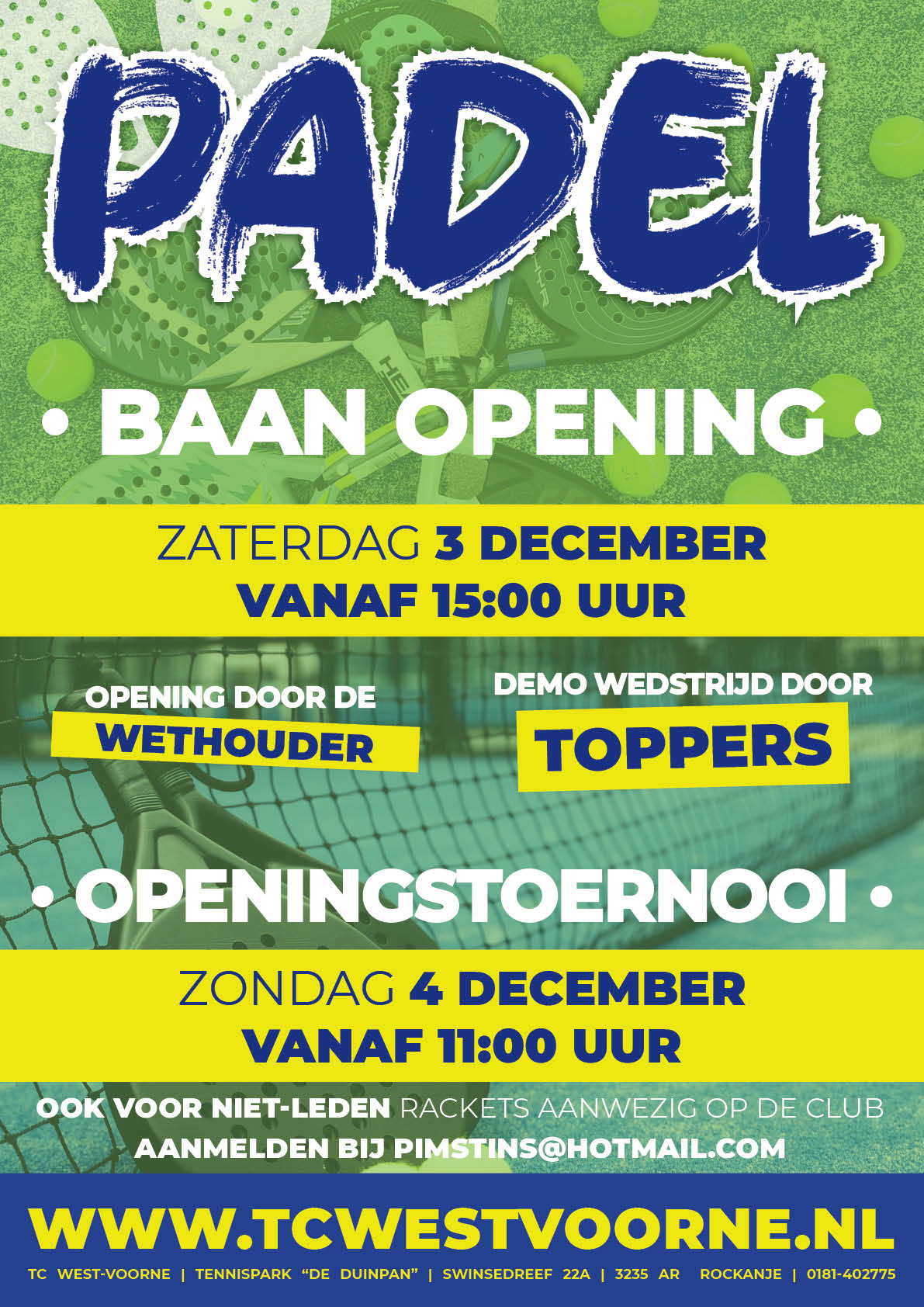 De padel banen worden op de 3 december om 15:00 geopend door wethouder Wilbert Borgonjen. Na de opening wordt er een demonstratiewijdstrijd gespeeld met toelichting van Raymond Schot, de tennis- en padelleraar van onze vereniging. Dit is interessant, want de regels wijken nogal wat af van tennis.