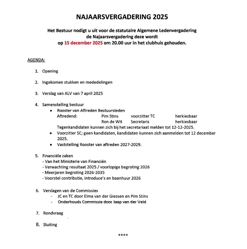 De agenda van de algemene leden vergadering van maandag 15 december 2025.